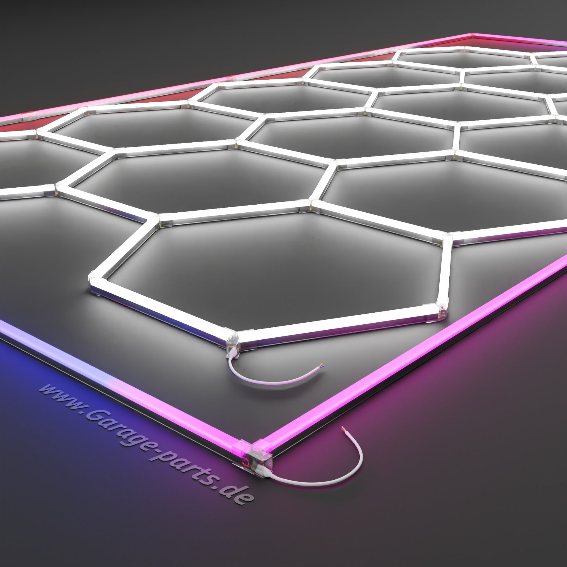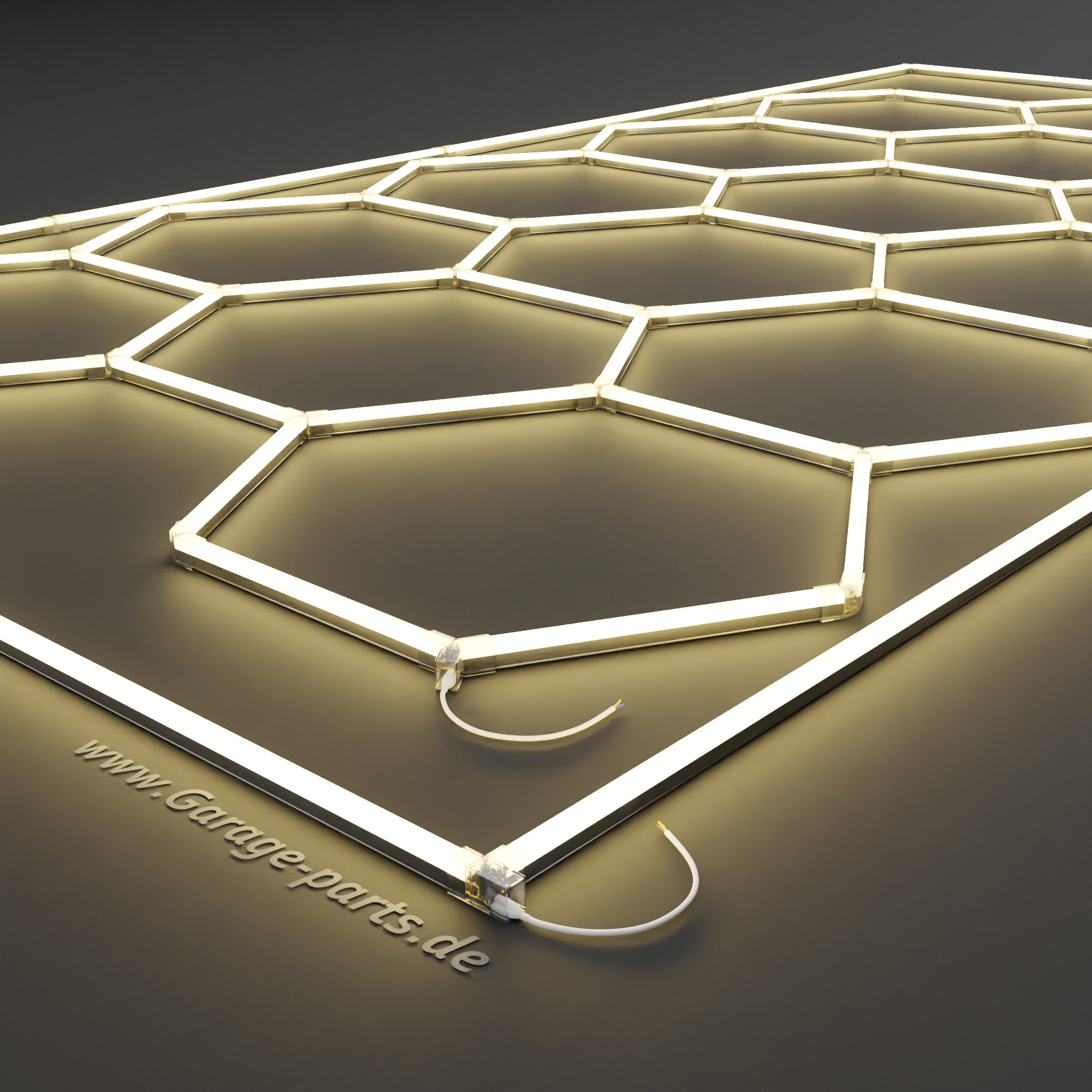 Mit einer Leuchtkraft von 110-120 lm/w Lumen und einem kaltweißen Farbton (6500K) erzeugt unser LED-Beleuchtungssystem ein perfekt helles Licht für Ihren gewünschten Bereich. Ob in der Garage, Werkstatt oder im Ausstellungsraum - unsere Beleuchtung lässt Ihre Räume erstrahlen. Machen Sie Ihre Gewerbehalle mit unserem professionellen Hexagon LED-System zu etwas ganz Besonderem!